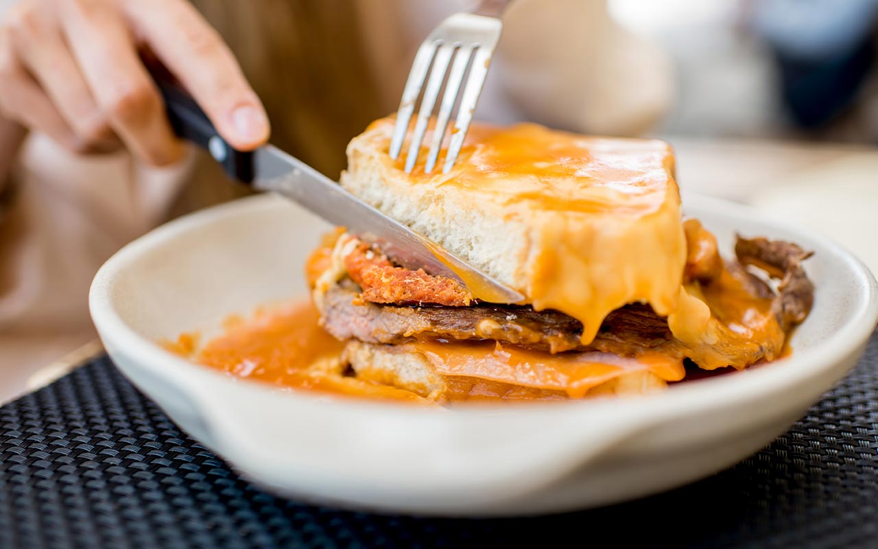 The name francesinha means “little Frenchie,” a nod to its inspiration, but there’s nothing small about this sandwich. Typically, it’s built with layers of juicy steak, cured ham, fresh sausage, and linguiça, all stacked between slices of bread, then covered with cheese and oven-melted to perfection. What truly sets it apart, however, is the sauce — a hot, thick, slightly spicy tomato-and-beer-based gravy that turns this into a knife-and-fork affair.